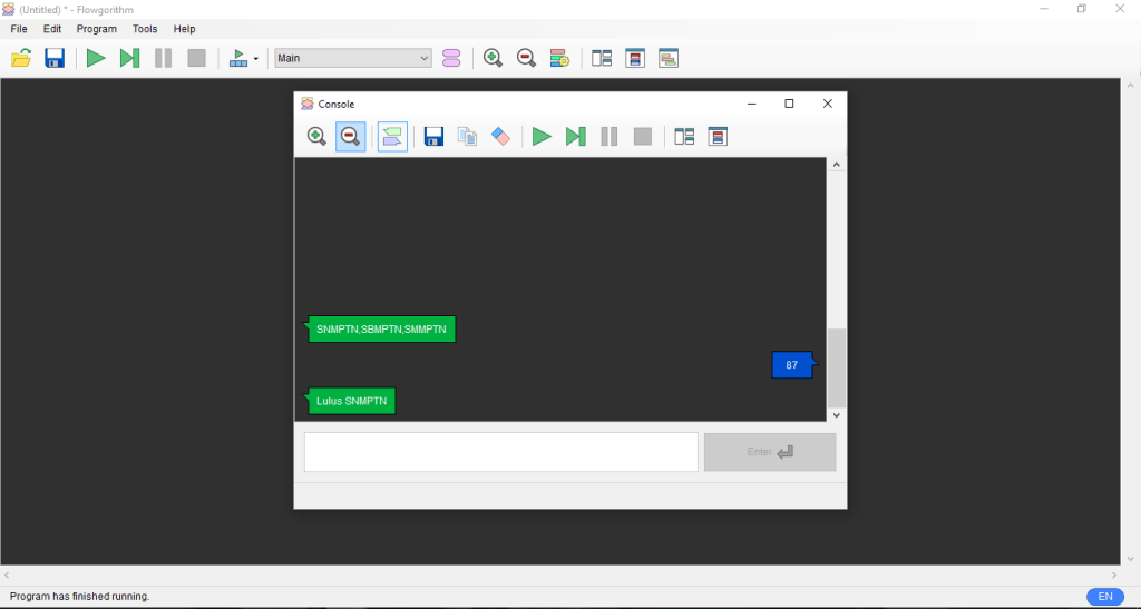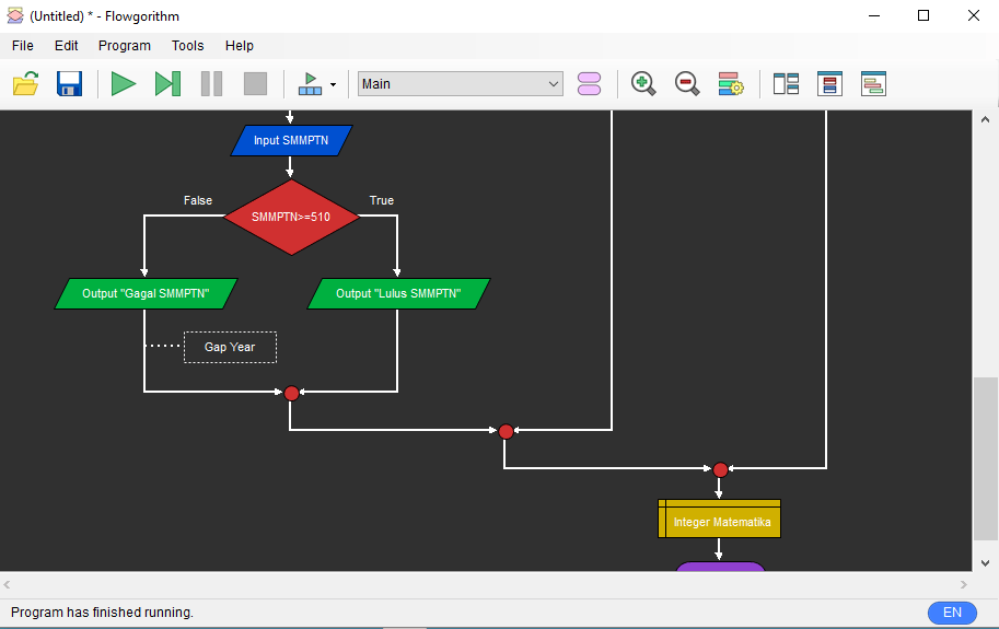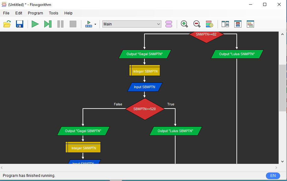- Untuk memvalidasi apakah bagan alir itu sudah berhasil atau belum, anda bisa menggunakan program Run yang berbentuk tanda panah hijau di pojok kiri atas.