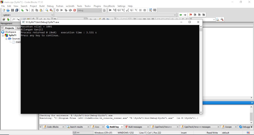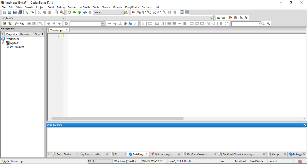 - Hal pertama yang perlu anda lakukan adalah membuka Aplikasi C++. Kali ini saya memakai aplikasi Code::Blocks untuk menjalankan program tersebut.