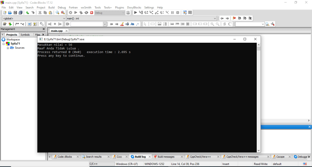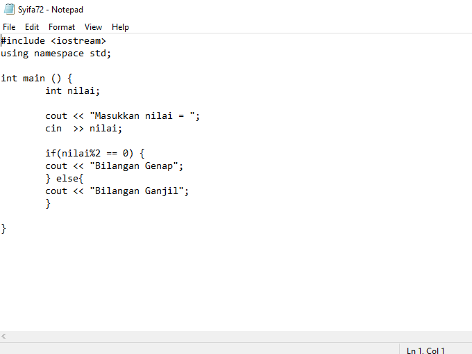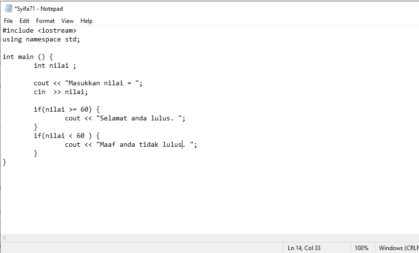 - Dan jika dituliskan ke dalam program C++ maka akan menghasilkan tampilan seperti ini.
