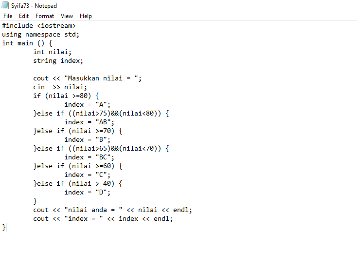 Pada program yang terakhir, sintaksis yang akan saya lakukan adalah mencari kategori untuk suatu nilai dengan menggunakan program If-else if.