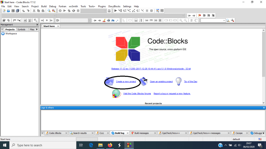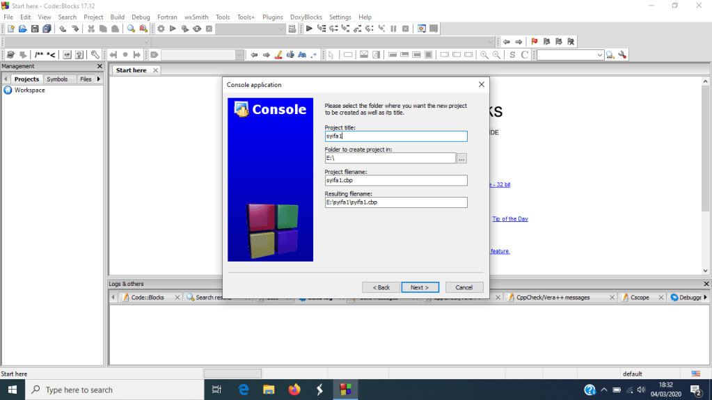 - Setelah anda membuka Code::Blocks, klik ikon create a new project. Setelah itu akan muncul new window baru yang berisi perintah untuk memberi judul pada program anda.