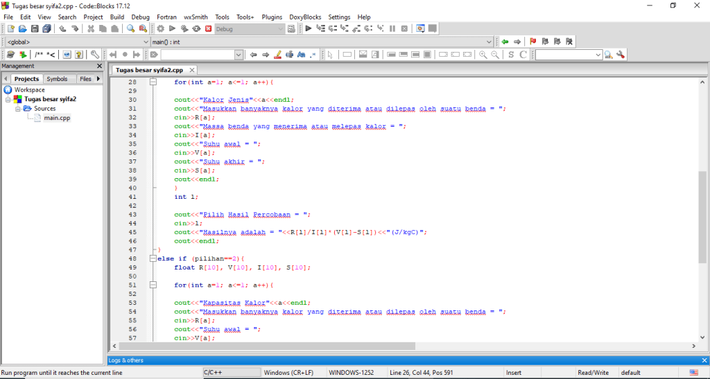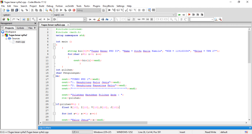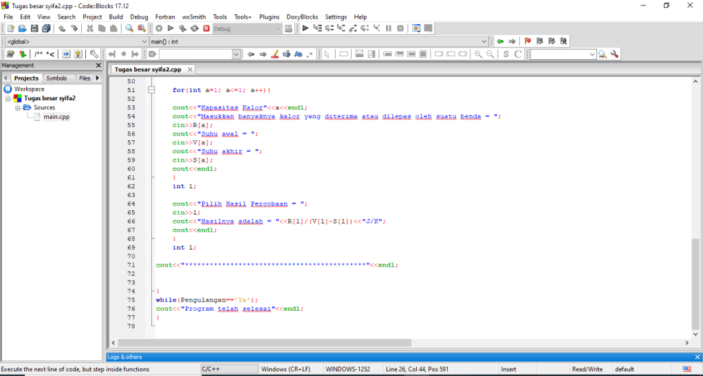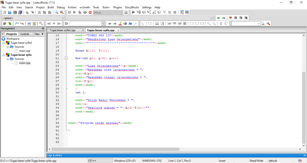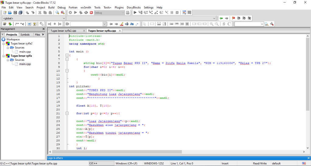 Jika dituliskan dalam aplikasi codeblock, maka akan menghasilkan tampilan seperti ini :