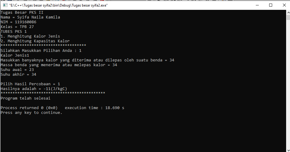 Saat di runningkan , program meminta untuk memilih dari dua rumus kalor, yaitu Kalor Jenis pada pilihan 1 dan Kapasitas Kalor pada pilihan 2 .Lalu program akan meminta input nilai banyaknya kalor yang dilepas atau diterima oleh suatu benda, suhu awal, suhu akhir dan jika memilih pilihan kalor jenis maka program juga akan meminta input nilai massa benda. Penentuan operasi yang akan dikerjakan menggunakan konsep percabangan. Jika memilih kalor jenis, maka hitung R[l]/I[l]*(V[l]-S[l]). Jika memilih kapasitas kalor, maka hitung R[l]/(V[l]-S[l]). Lalu tampilkan hasilnya ke layar.